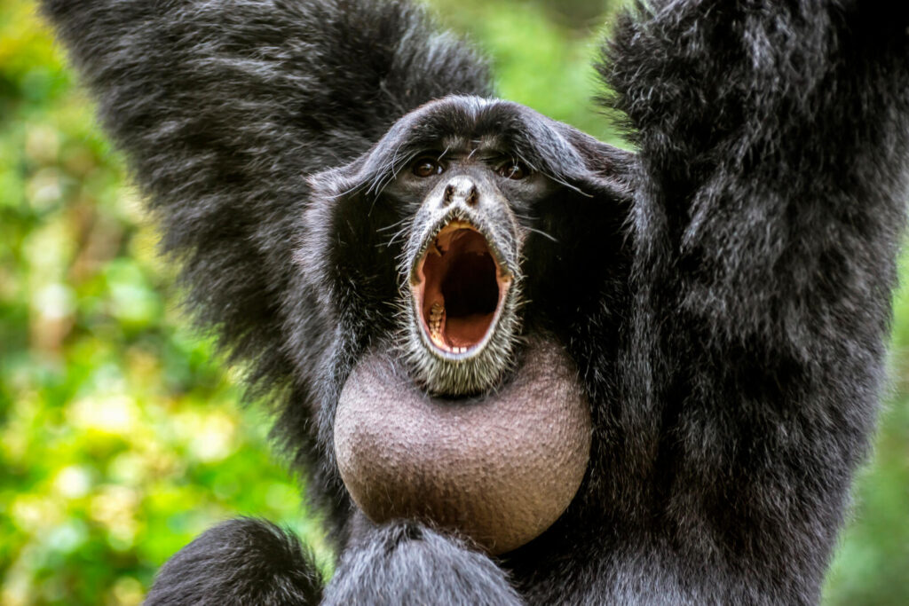 The Siamang Gibbon makes sounds that can be heard two miles away.