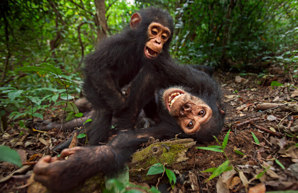 As it is with human children, chimpanzees like to have fun. Playtime is an important developmental activity and can lead to breathy laughter. Three-year-old Gizmo and his 8-year-old brother Gimli enjoyed a bit of roughhousing at Tanzania’s Gombe Stream National Park.