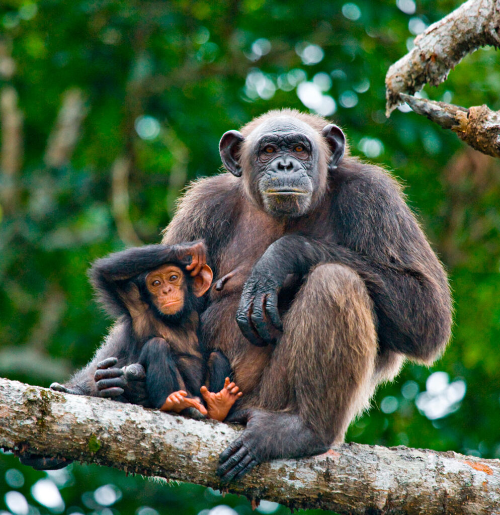 A chimpanzee mother and her baby at the Conkouati-Douli National Park in the Republic of Congo.