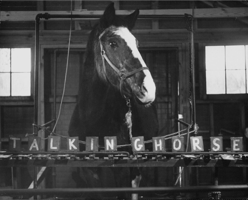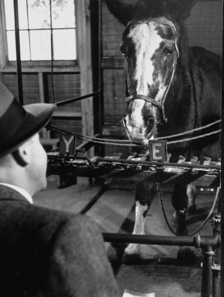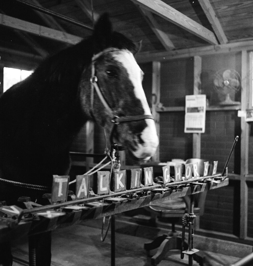 Lady Wonder, the purported clairvoyant horse, gave a Massachusetts businessman direction on where to get a loan, spelling out “Heancock,” which was interpreted to mean the insurance company John Hancock, 1952.