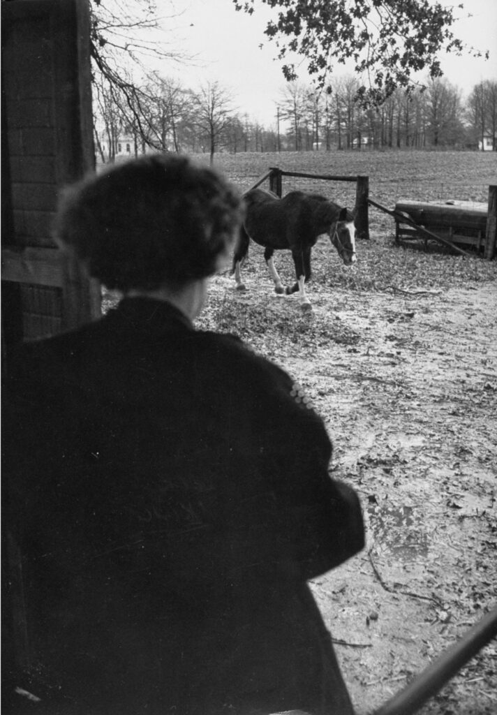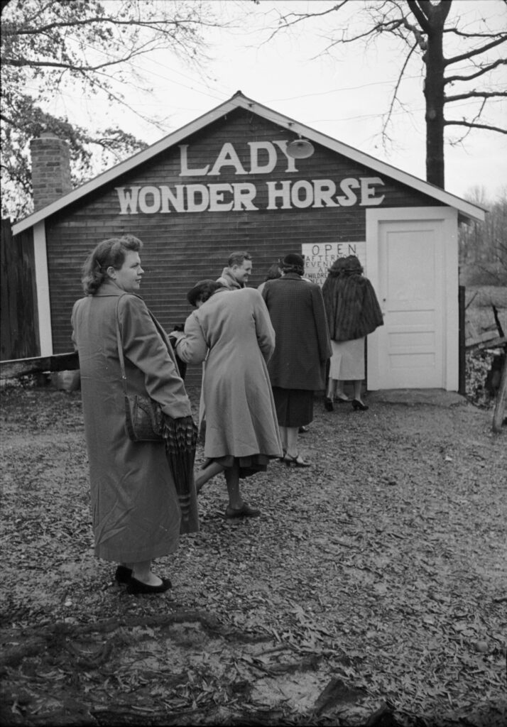 “Lady Wonder,” a horse with the purported ability to see the future, came in from the pasture to answer questions for her customers, Richmond, Va., 1952.